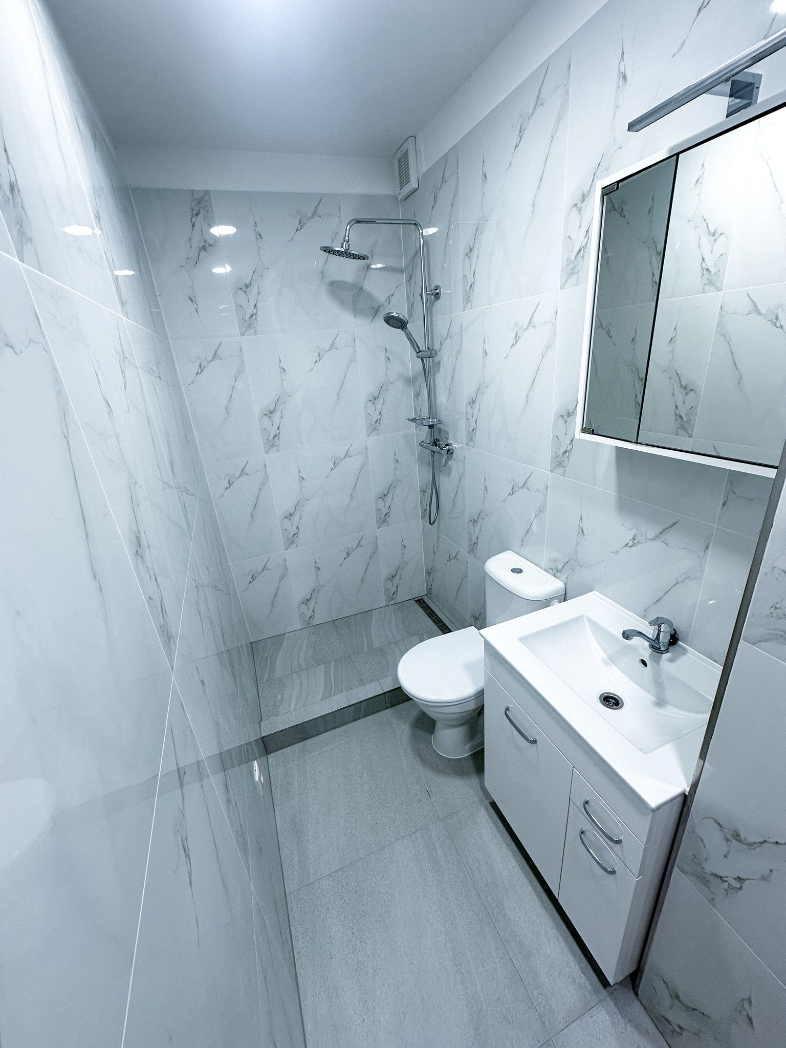 Také koupelna projde kompletní obnovou – její výsledná podoba bude odpovídat standardu, který můžete vidět v bytě Slovinská byt 21. Tento byt je momentálně skrytý, proto je nutné ho vyhledat ručně přes vyhledávač zadáním názvu Slovinská byt 21.